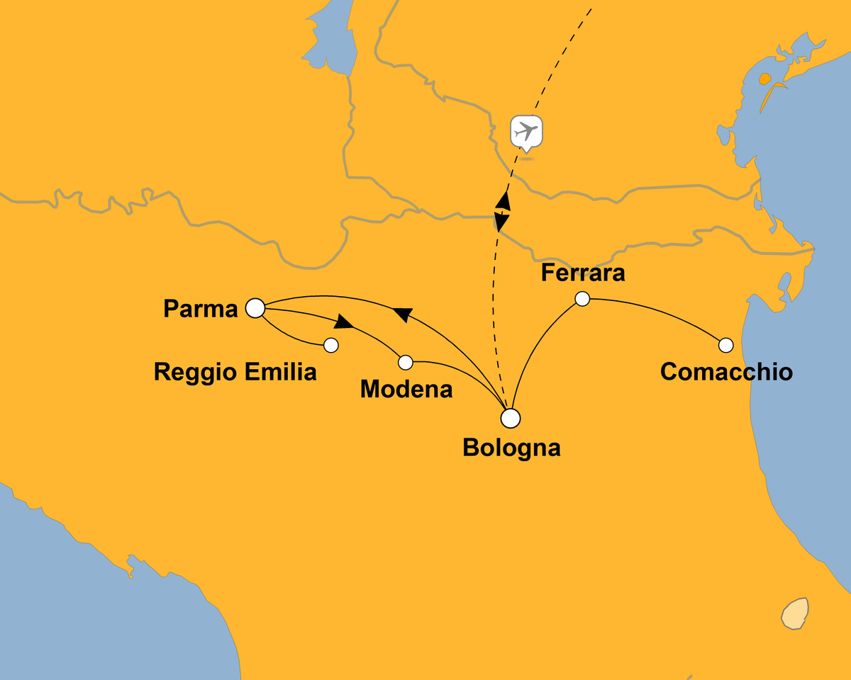 - Stadtbesichtigungen: Parma, Bologna, Ferrara, Comacchio, Modena